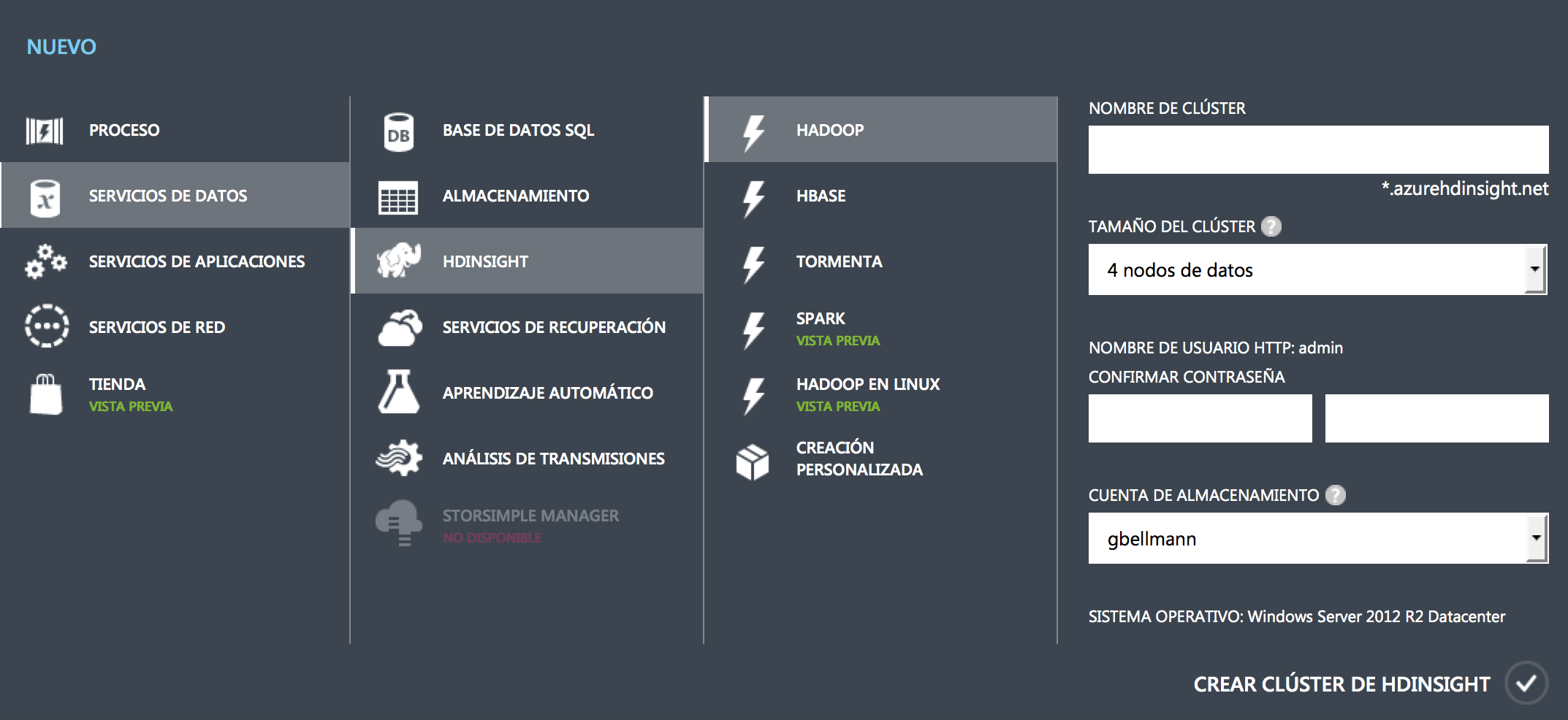 Pingback: Creando un clúster Hadoop en HDInsight – Parte 2 | Guillermo Bellmann
