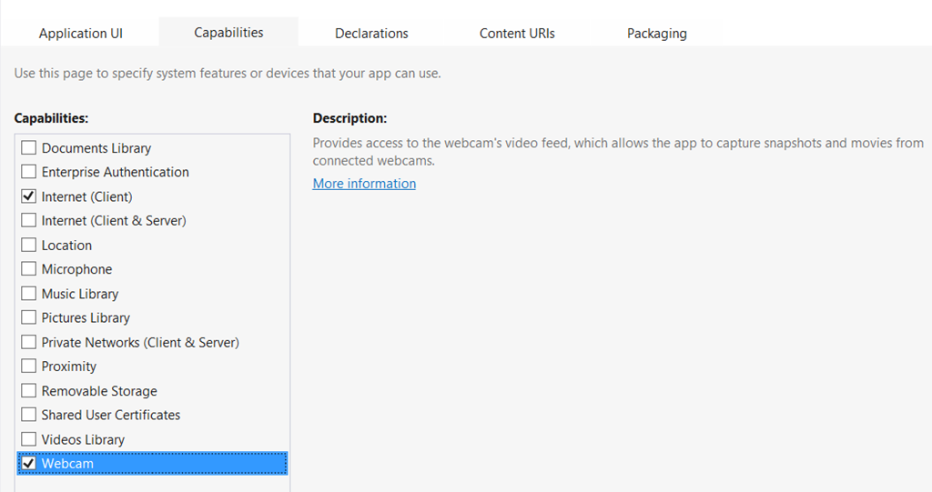 Lo único que nos falta es declarar que nuestra aplicación utiliza la cámara para poder utilizarla. Para ello vamos al manifiesto de nuestra aplicación (package.appxmanifest), y tildamos webcam dentro de la solapa Capabilities.